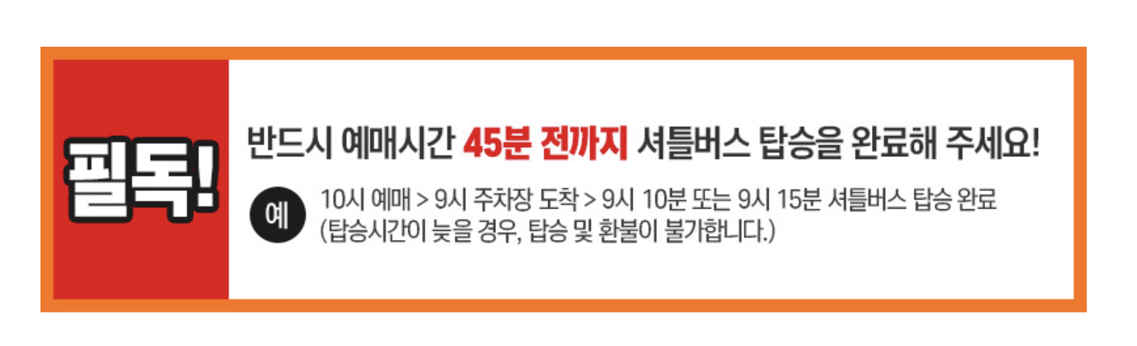예를 들어, 10시 예매 시 8시 50분 주차장 도착 > 9시에 셔틀버스 탑승완료